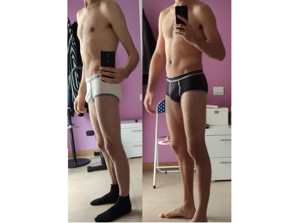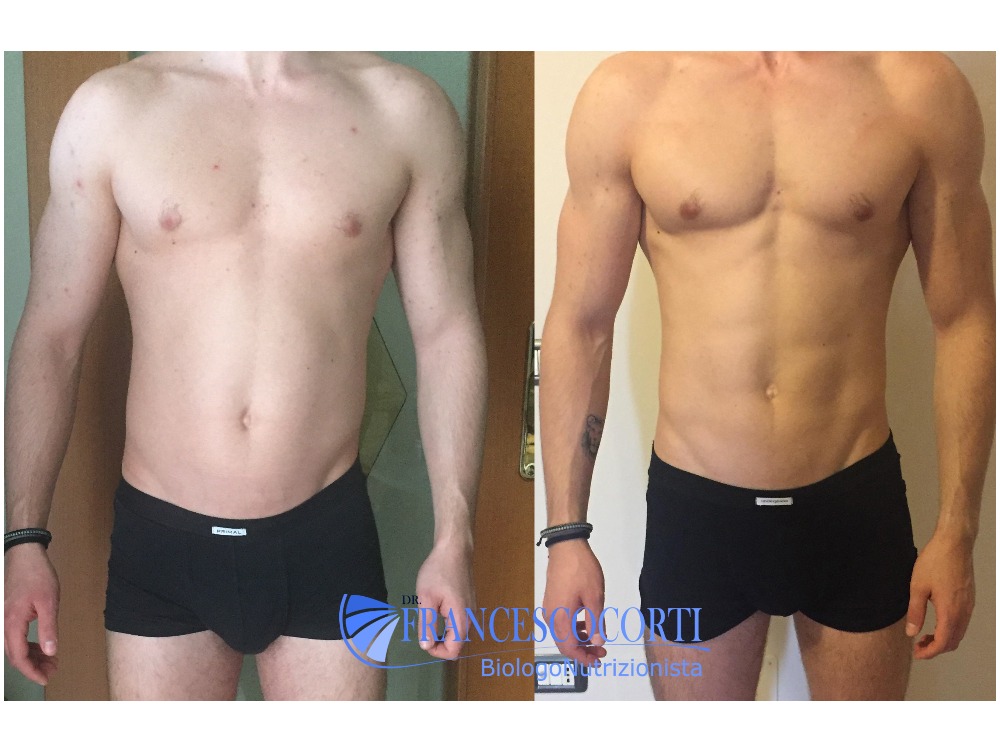 Ragazzo sportivo alla ricerca di una maggiore definizione muscolare. Alla prima visita, la massa muscolare era già in buono stato ma c'era un certo accumulo di adipe a livello dell'addome e soprattutto a livello di cosce e glutei. A seguito di una alimentazione/integrazione attenta e controllata e di un allenamento costante, la composizione corporea è migliorata sensibilmente: la massa grassa si è ridotta anche nei punti critici e la massa muscolare è rimasta perfettamente conservata.