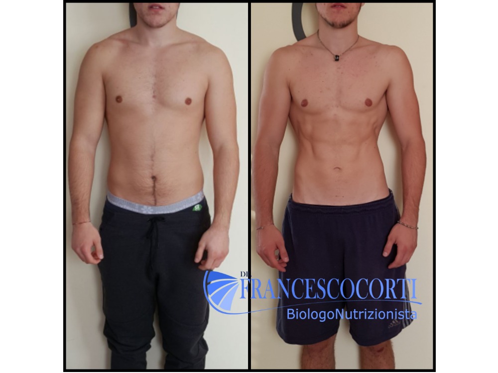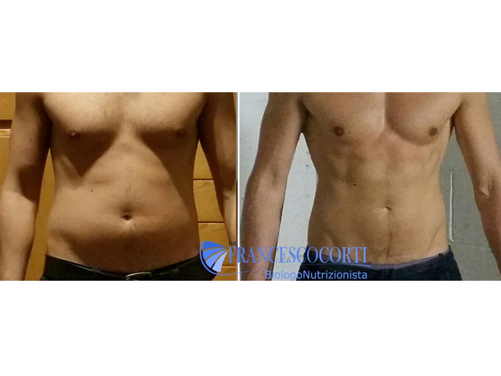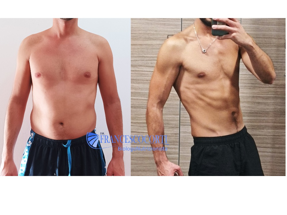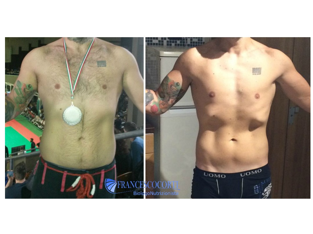 Atleta con necessità di rientrare in una categoria di peso prima di un match di arti marziali. ~11 i kg persi. Il risultato è stato ottenuto coniugando una dieta ipocalorica con alcune tecniche di taglio del peso in acuto gli ultimi giorni prima della gara. Nonostante il calo netto di peso, la massa muscolare alla analisi bioimpedenziometrica e all'ecografo è risultata mantenuta. Pertanto, il calo di peso è stato prevalentemente a carico della massa grassa (e in minor parte anche della componente idrica della massa magra) e non della massa muscolare (intesa come fibre vere e proprie).L'avere un obiettivo imminente da raggiungere e l'avere un supporto continuo da parte mia e dello staff della palestra hanno fatto la differenza a livello psicologico.
