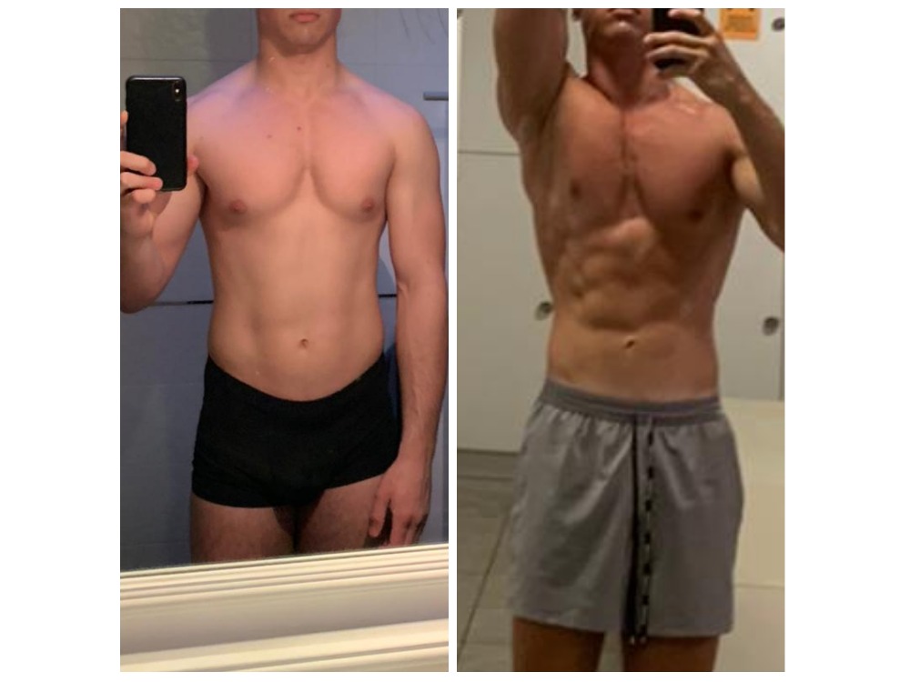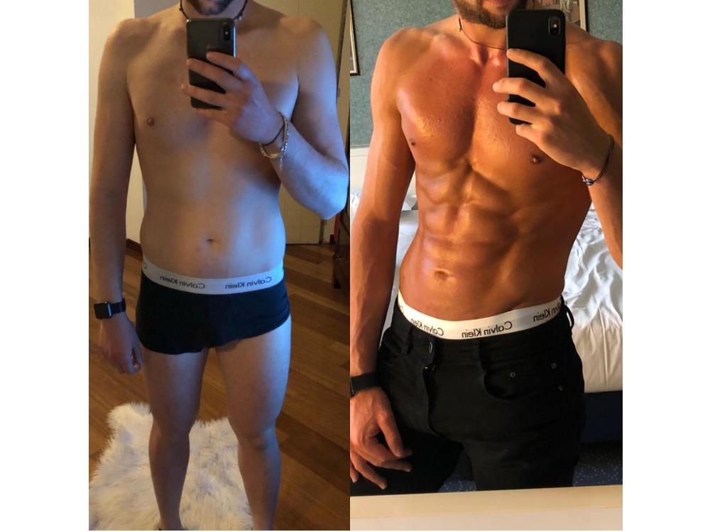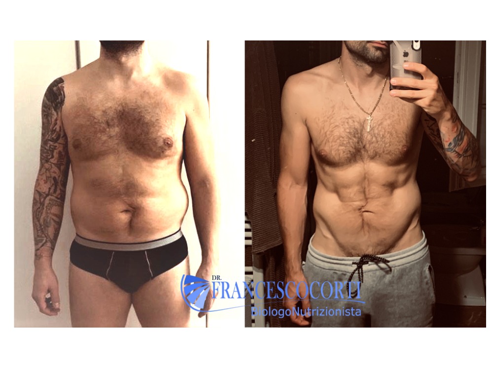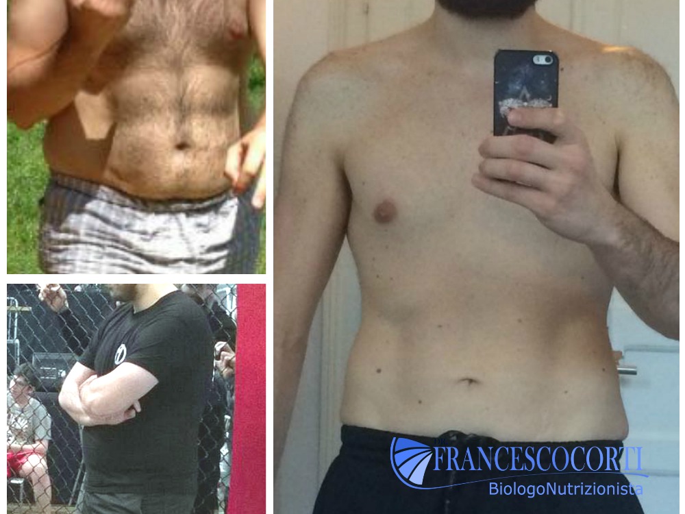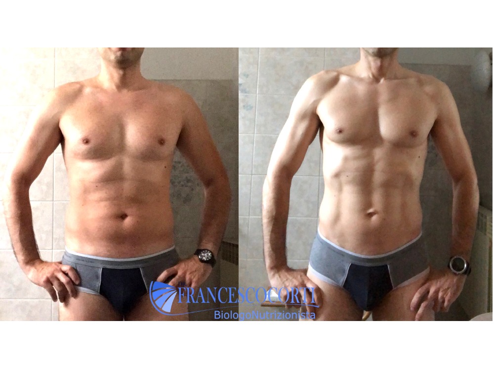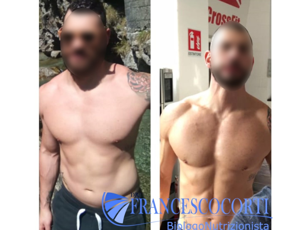 Trasformazione corporea ottenuta seguendo una alimentazione contenente finestre di digiuno programmato, grassi di qualità relativamente elevati e carboidrati moderati e temporizzati. Questa particolare impostazione dietetica è stata dettata prevalentemente dal fatto che la persona tendeva a ricadere in abbuffate, specialmente di carboidrati. L'approccio si è rivelato, per un periodo piuttosto lungo, quello vincente. Poi è stata cambiata strategia per rendere la dieta più sostenibile nel tempo.